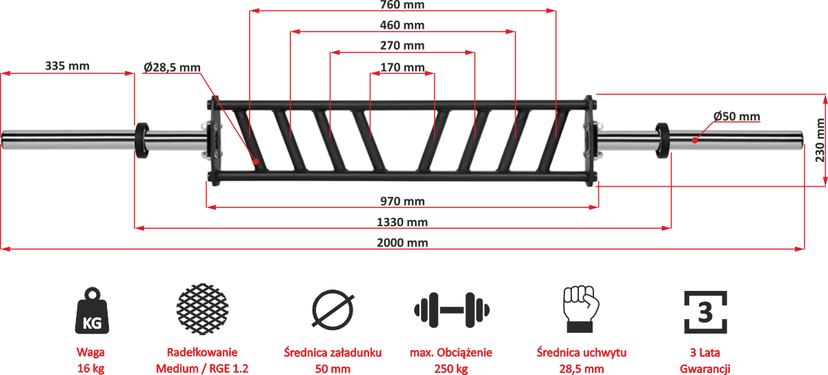 Total length of the MG-A-50 grid | 200 cm. Diameter of the weight pins | ∅50 mm. They are supported by Olympic plates with an internal diameter of at least ∅50.4 mm. Thanks to the flat design, the grid can be used on both sides, which allows for 4 different grip widths. The solid construction made of thick-walled oval steel pipe and a solid, steel weight holder guarantee maximum durability.